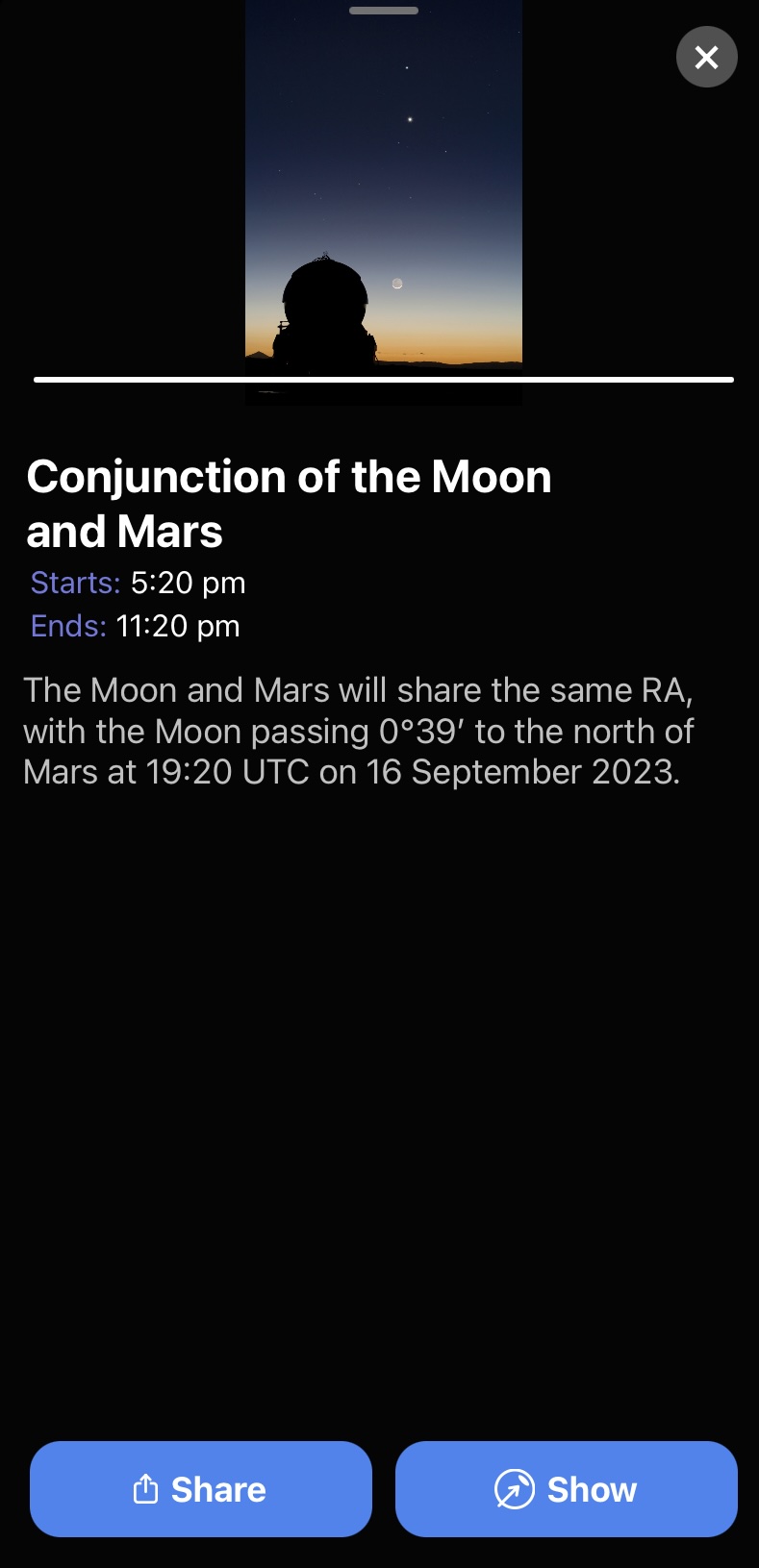 Night Sky supports Interactive Widgets in iOS 17. You can favorite an object from the Interactive Widget to get notifications about it rising in the future.