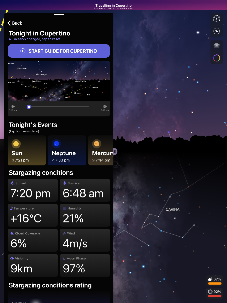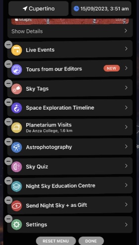 Push notifications are needed to update you about the stargazing conditions, rising times of objects, International Space Station (ISS) and Starlink satellite flyovers, breaking news stories and other events. Notifications can be customised in the app’s Settings.