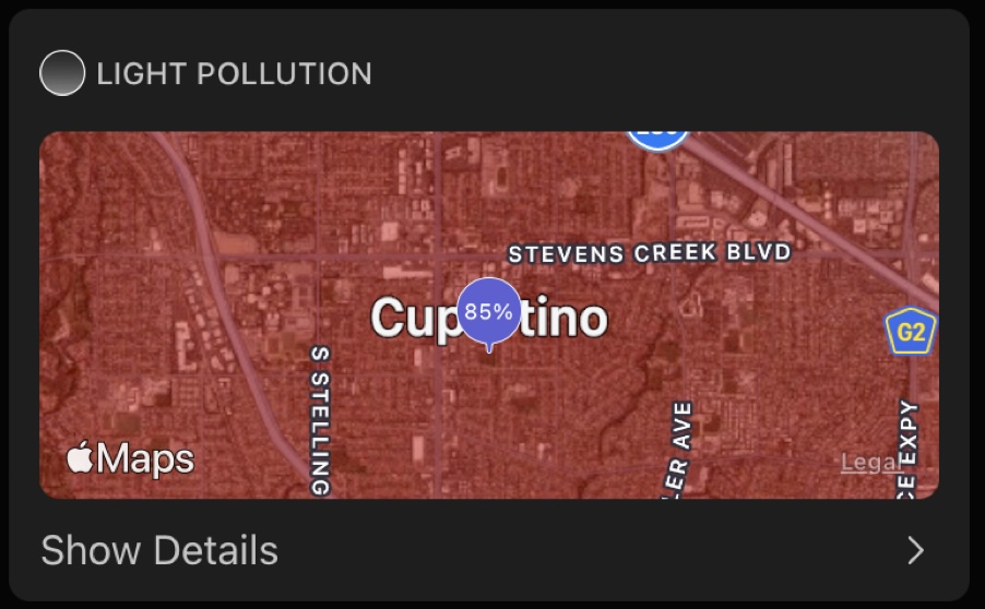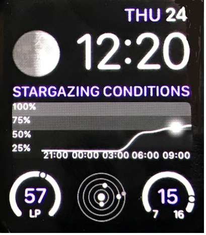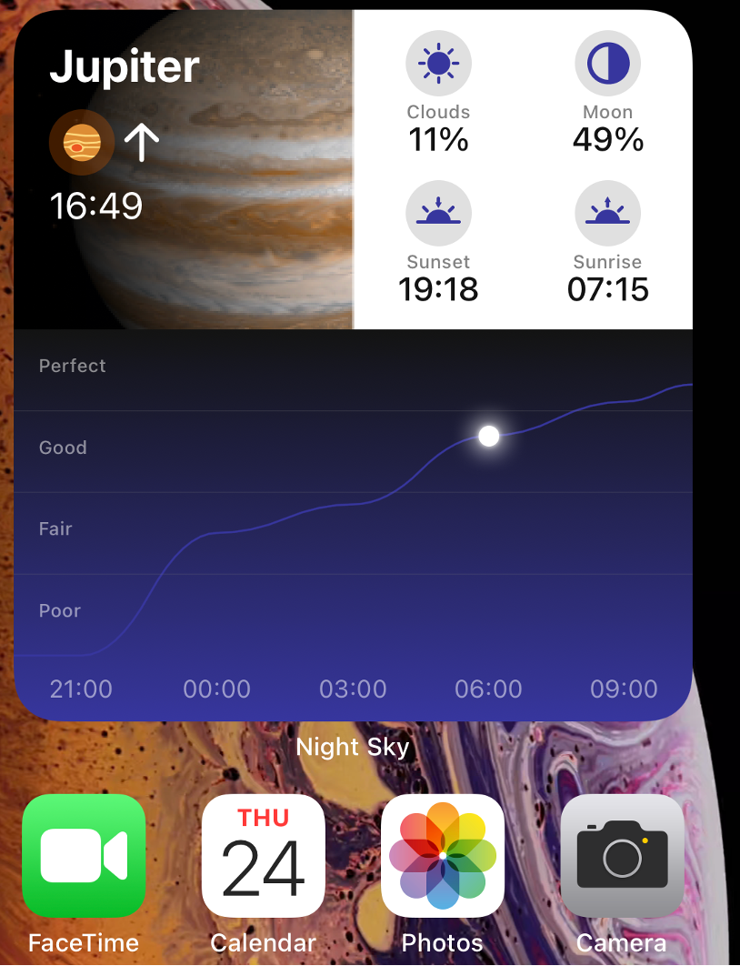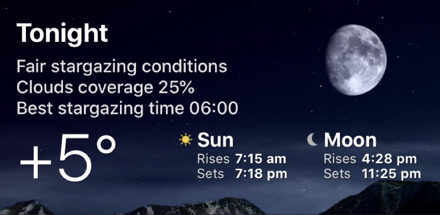 • The large size Widget also shows a graph of the estimated stargazing conditions over the next 12 hours. A dot on the graph shows the time between sunset and sunrise when the weather conditions are projected to be best for star gazing.