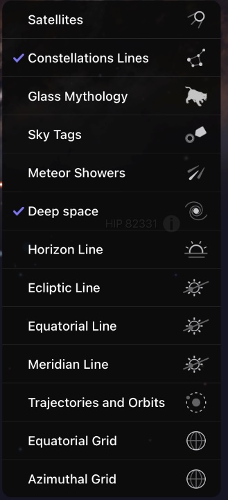 Use this button to open a menu listing display options to quickly customise Sky View to present the data that is most important to you. Tapping on these will select or unselect options. These options can also be selected through the Preferences menu. See the Preferences section for detailed descriptions.