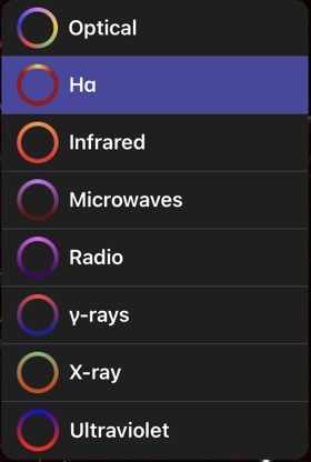 Sky View defaults to show you the sky as it appears to human eyes (optical view), but you can select a simulated sky background in other wavelengths by tapping on this button. You can cycle through the wavelengths by tapping repeatedly on this button.
