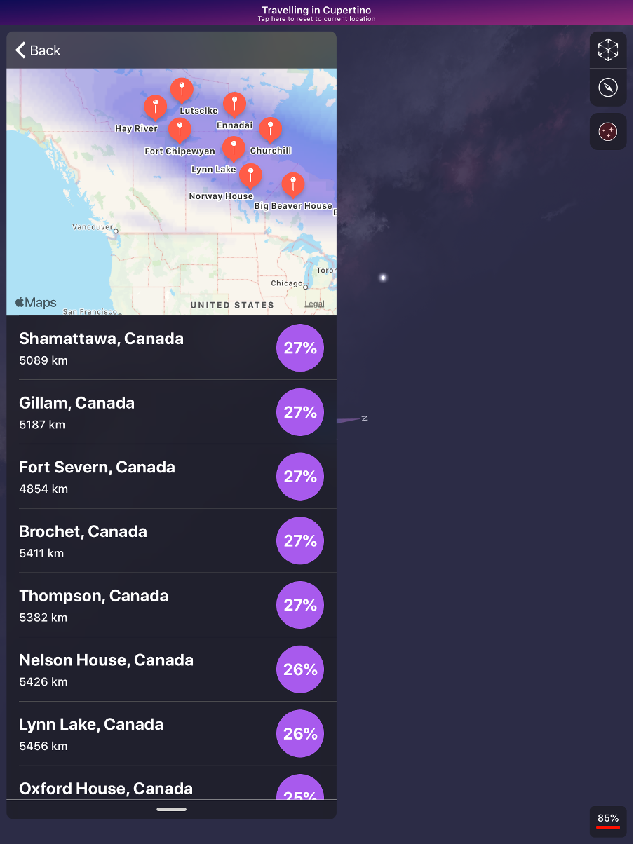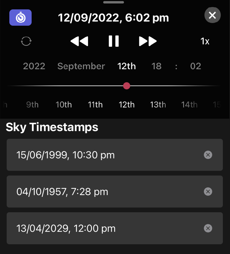 The sky is displayed at the current time, turn the Digital Crown to advance or turn back the time (Space Travel mode).