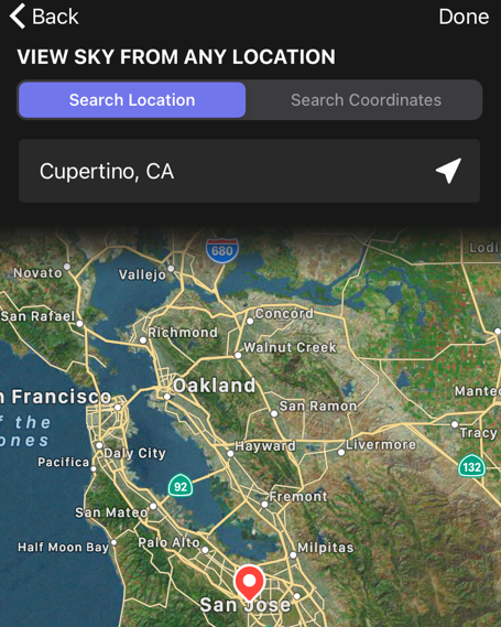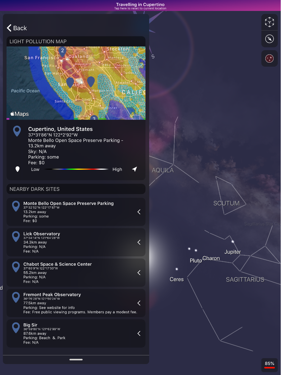 Place two fingers anywhere in Sky View and move them up or down to increase or decrease star density. This will simulate different types of sky based on light pollution, from inner city skies to an excellent dark sky sites.