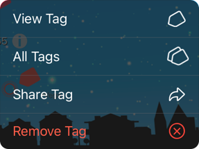 Share Tag: This opens a tile with options to share the Tag with other Night Sky users by email, messaging or social media apps. Shared Sky Tags appear as links in emails, messages and social media posts. When the recipient taps on this link Night Sky opens and the Tag is added to the list of Sky Tags.