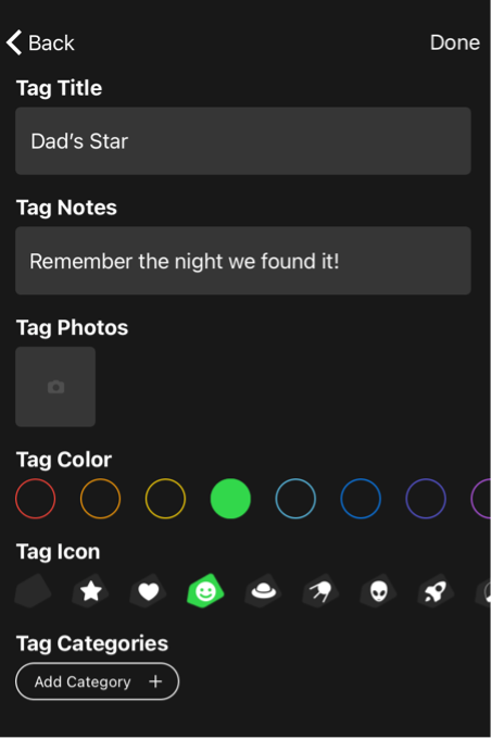 On this tile you can name the Tag and add notes (for example when you saw the star you are tagging, why it is important). You can link a photo to the Tag and edit the colour of the Tag. There is a range of Icons you can select for your Tag. Tags can be added to a category (Favorite, Memorials, Sightings, Observational Planning, Family or your own custom category). Select Done when you have finished creating your Tag. This will also offer you the option of adding the new Tag to your Notifications.