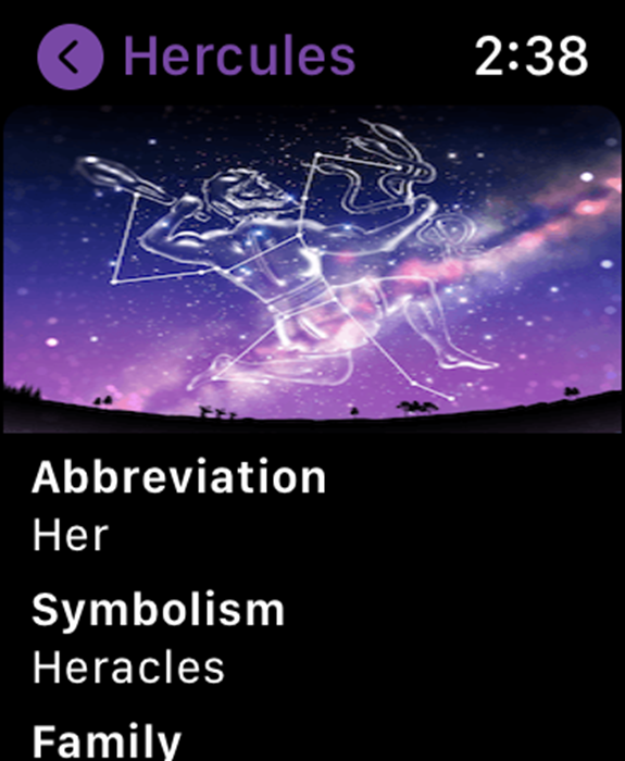 Double tapping on a constellation’s name brings up a three dimensional view of the constellation which you can rotate with your finger to see the stars’ relative distances. Tapping on the X in the corner will return to Sky View.